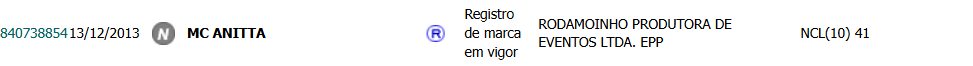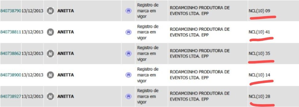 Os registros contemplam o próprio nome artístico da cantora, variações como “Anira”, “Anittinha” e “MC Anitta”, produtos da carreira como “Show das Poderosas”, “Bloco das Poderosas”, dentre vários outros.