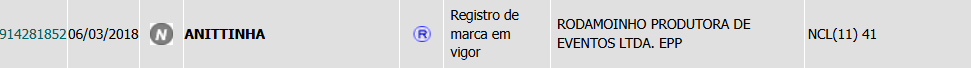Veja, em nome da Rodamoinho (produtora da Anitta), são 110 processos de registro no INPI:
